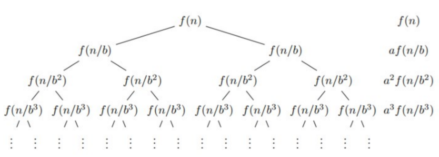 $$ T(n) = n^c \sum_{k=0}^{\log_b n} \left(\frac{a}{b^c}\right)^k = n^c \sum_{k=0}^{\log_b n} 1^k = \Theta(n^c \log_b n) $$ C. Если $c < \log_b a$, то так как сумма прогрессии асимптотически эквивалентна своему старшему элементу, $$ T(n) = n^c \sum_{k=0}^{\log_b n} \left(\frac{a}{b^c}\right)^k = \Theta\left(n^c \left(\frac{a}{b^c}\right)^{\log_b n}\right) = \Theta\left(n^c \cdot \frac{a^{\log_b n}}{n^c}\right) = \Theta(a^{\log_b n}) = \Theta(n^{\log_b a}) $$ Примечание. Для более точных оценок асимптотики «мерджа» теорема ничего не говорит. Например, если мердж занимает $\Theta(n \log n)$ и задача разбивается каждый раз на две части, то асимптотика будет равна: $$ \sum_{k=0}^{\log n} n \log \frac{n}{2^k} = \sum_{k=0}^{\log n} n (\log n - k) = n \sum_{k=0}^{\log n} k = \Theta (n \log^2 n) $$ В то же время эта рекуррента под условия теоремы не попадает. Можно лишь получить неточные границы $\Omega (n \log n)$ и $O(n^{1+\varepsilon})$, если подставить $c = 1$ и $c = 1 + \varepsilon$ соответственно. Заметим, что $n \log n$ и $n \log^2 n$ асимптотически меньше $n^{1+\varepsilon}$, каким бы маленьким $\varepsilon$ ни был.