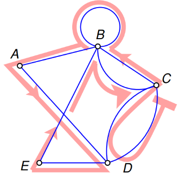 Также существует понятие гамильтонова пути и цикла — они посещают все вершины по разу, а не рёбра. Нахождение гамильтонова цикла (задача коммивояжера, англ. travelling salesman problem) — одна из самых известных NP-полных задач, в то время как нахождение эйлерова цика решается за линейное время, и мы сейчас покажем, как.