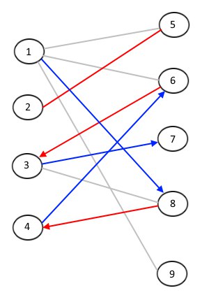 В примере выше добавятся синие рёбра $(1, 8)$, $(3, 7)$ и $(4, 6)$, а удалятся красные $(3, 6)$ и $(4, 8)$. С ребром $(2, 5)$ ничего не случится — оно не в увеличивающей цепи. Таким образом, размер паросочетания увеличится на единицу.