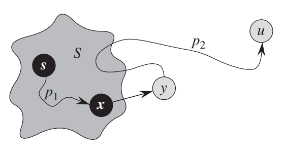 Рассмотрим любой кратчайший путь до вершины $v$. Обозначим первую непомеченную вершину на этом пути за $y$, а предшествующую ей помеченную за $x$ (они будут существовать, потому что вершина $s$ помечена, а вершина $v$ — нет). Обозначим вес ребра $(x, y)$ за $w$.