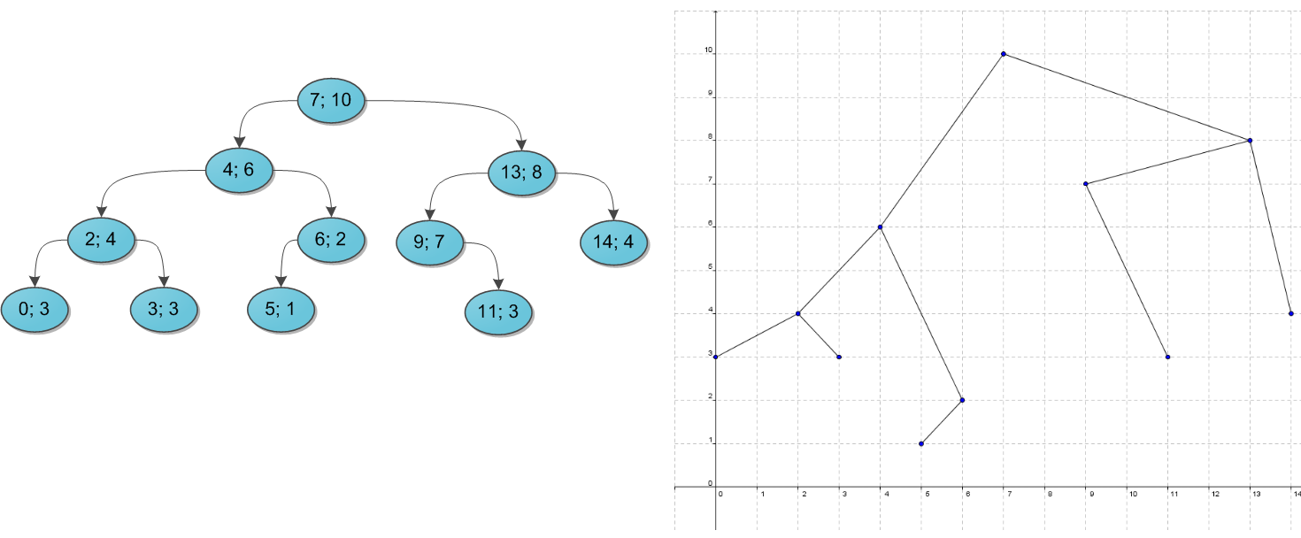 Таким образом, декартово дерево — это одновременно бинарное дерево по $x$ и куча по $y$. Поэтому ему придумали много альтернативных названий: